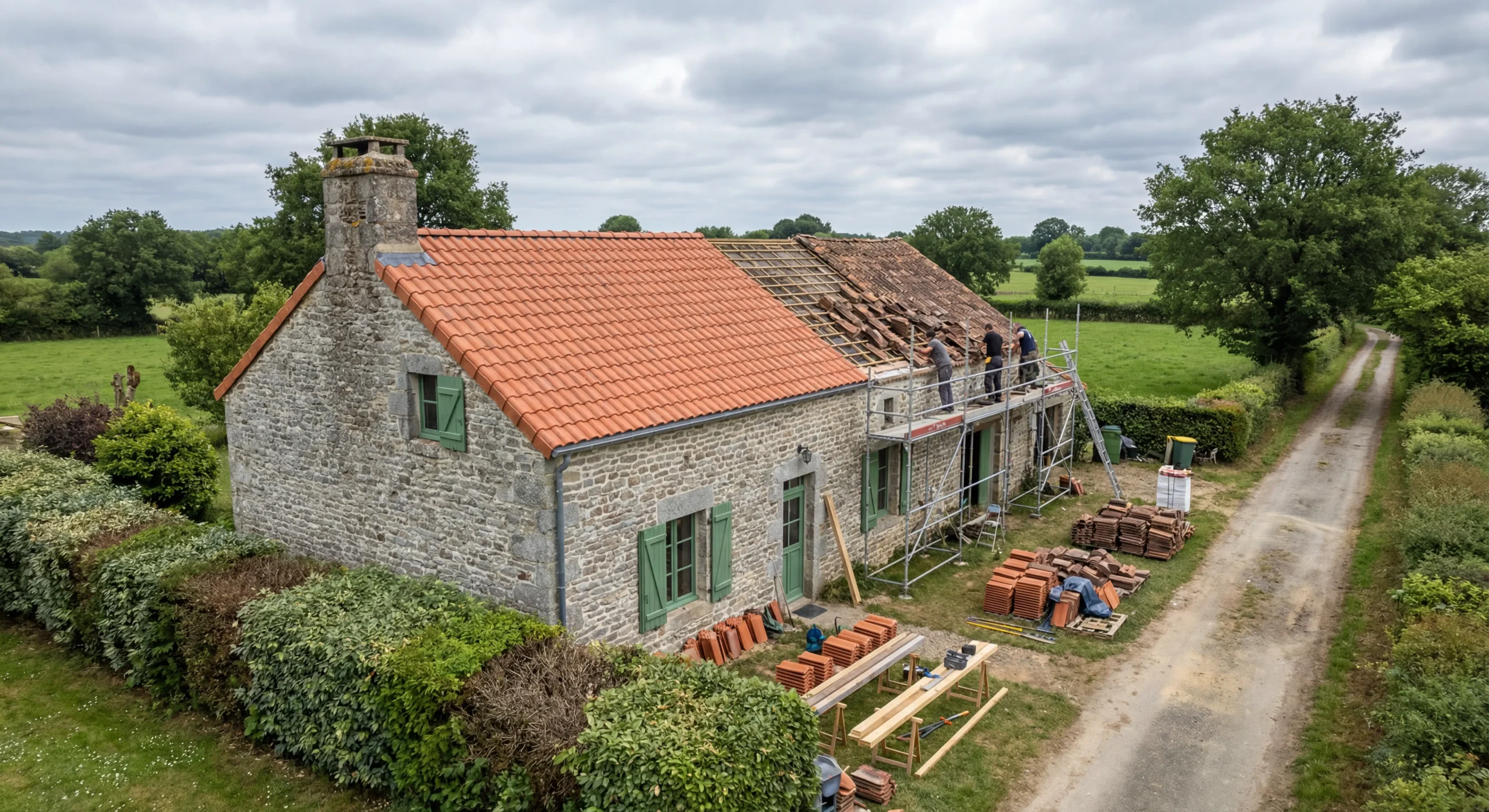 Pour 120m² de toiture dans les Deux-Sèvres, comptez 14 000-24 000€ selon complexité (réfection simple à rénovation complète avec isolation). Avec les aides cumulées (MaPrimeRénov’, CEE, aides Nouvelle-Aquitaine, subventions départementales), le reste à charge descend souvent à 7 500-15 000€. Financement échelonné possible.